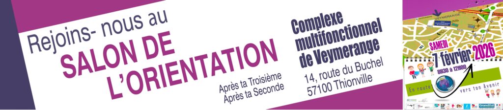 Salon de l’orientation Samedi 7 Février 2026 de 8h30 à 12h00 après ta 3e, après ta 2nd En route vers mon avenir Cité Scolaire Julie Daubié ROMBAS LPO La Briquerie THIONVILLE Lycée des Métiers Gustave Eiffel TALANGE Lycée Maryse Bastié HAYANGE Lycée Polyvalent Rosa Parks THIONVILLE Lycée Professionnel Jean Macé FAMECK Lycée Saint André OTTANGE Lycée Saint Vincent de Paul ALGRANGE